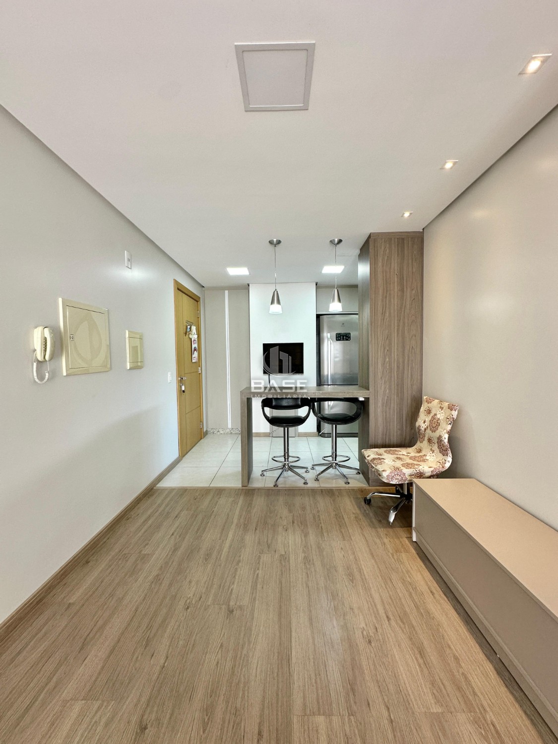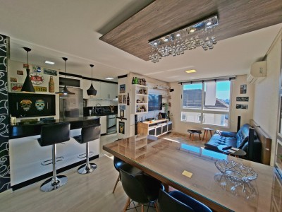 Descrição › Apartamento semi mobiliado com 2 dormitórios sendo 1 suíte, sala de estar e jantar integradas, cozinha com churrasqueira, área de serviço, amplo terraço com posição solar oeste, banheiro social e 1 vaga dupla de garagem.